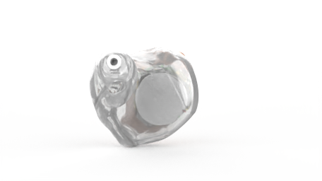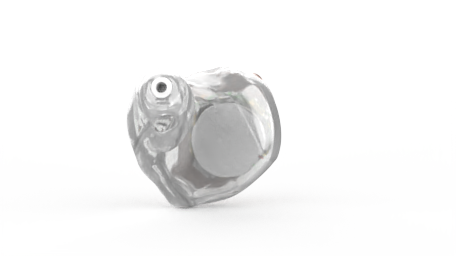 Custom hearing aids that are partially visible in the outer ear.